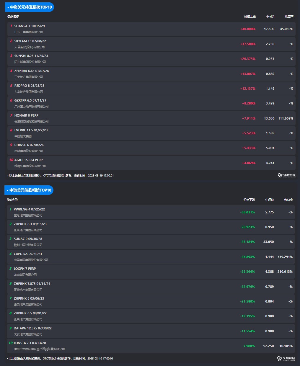 3月19日,中资美元债涨跌幅榜TOP10如下: